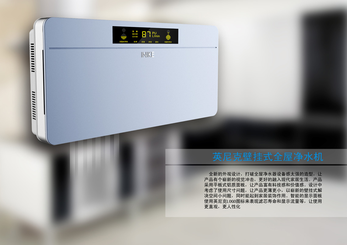 CREATIVE DESCRIPTION: Water purifier new design, to break the whole house water purifier device feeling too strong shape, so that the product has a new visual impact, better integration into the modern home life. Products using flat aluminum panels, so that products rich sense of science and technology and sense of value. Designed to consider the use of size problems, so that the product thinner and smaller, with a new wall-mounted solution to the problem of small space, but also can play the role of home decoration. Smart display panel using the British logo logo to display the filter life and display flow, so that the use of more intuitive, more humane.