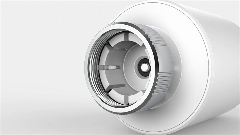 金屬旋鈕的內(nèi)齒紋設(shè)計(jì)使其能與暖氣閥門緊密連接,接口簡潔。顯示屏在熄滅狀態(tài)下與白色面板融為一體,保持外觀的整體性。