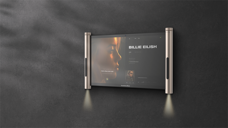這一設(shè)計(jì)淡化了科技產(chǎn)品的機(jī)械感,賦予墻面懸掛的藝術(shù)氣質(zhì)。整體比例經(jīng)過精心推敲,既確保顯示區(qū)域的舒適視野,又使“軸桿”成為點(diǎn)睛裝飾。