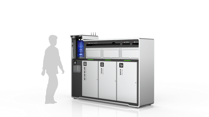 頂部交互區(qū)以優(yōu)雅的弧形向下延伸,與直立的主體形成流暢過渡。中部投放區(qū)通過色彩和圖標(biāo)進(jìn)行明確的功能分區(qū),不同分類口采用差異化設(shè)計(jì),既確保識(shí)別度又保持整體美感。