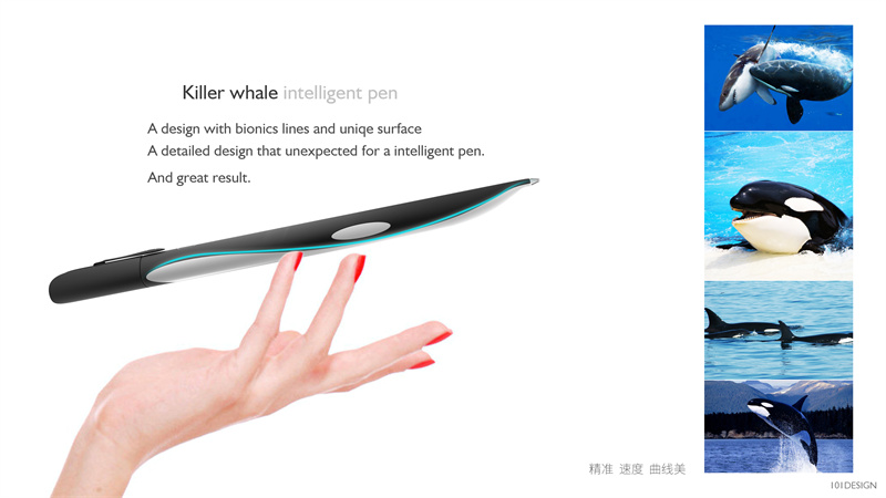 智能筆的設(shè)計(jì)靈感源自于自然界中令人敬畏的虎鯨。這種智慧而強(qiáng)大的海洋生物以其獨(dú)特的體態(tài)、流線型的身體和敏銳的感官,成為了設(shè)計(jì)師們心中的靈感源泉。設(shè)計(jì)師巧妙地將虎鯨的仿生學(xué)特征融入筆身設(shè)計(jì)之中,不僅賦予了這款智能筆獨(dú)特的視覺沖擊力,更讓其在功能上得到了前所未有的提升。