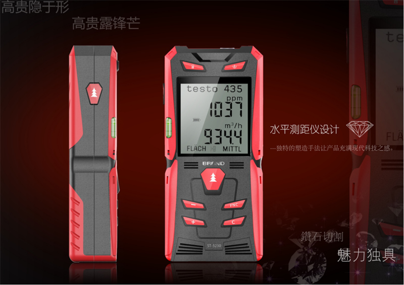 在色彩搭配上,這款測(cè)距儀巧妙地運(yùn)用了鮮明的紅色與沉穩(wěn)的黑色,形成了強(qiáng)烈的視覺(jué)沖擊力。